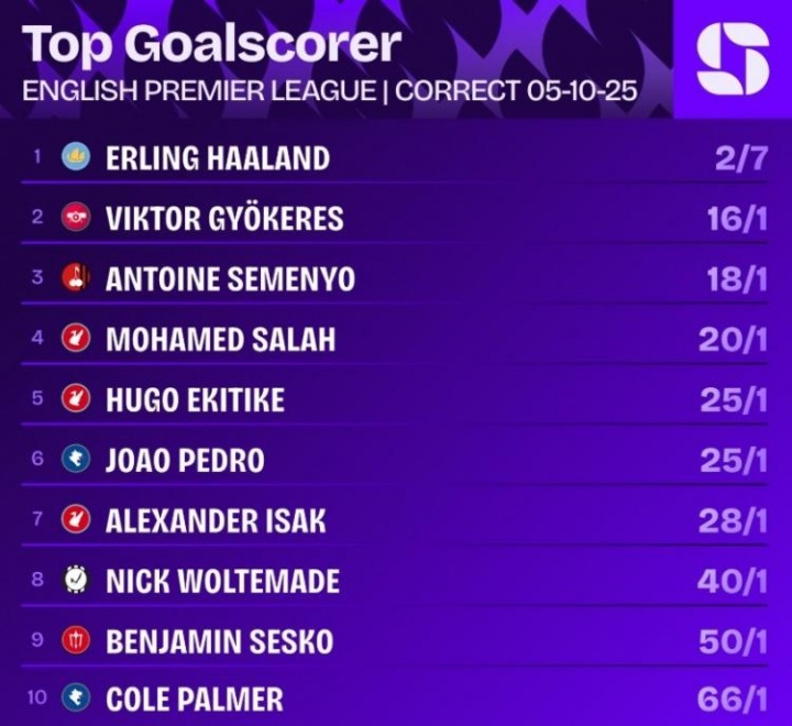 10月6日讯 英超第7轮比赛,曼城以1-0的比分小胜布伦特福德,哈兰德打进全场唯一进球。本场比赛之后,挪威射手以9球位居射手榜首位,领先次席的塞梅尼奥3球。