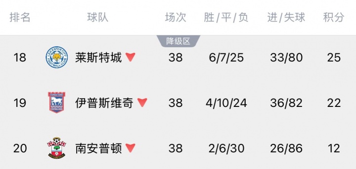 南安普顿上赛季38轮仅取得2胜6平30负12个积分,早早锁定一个降级名额。